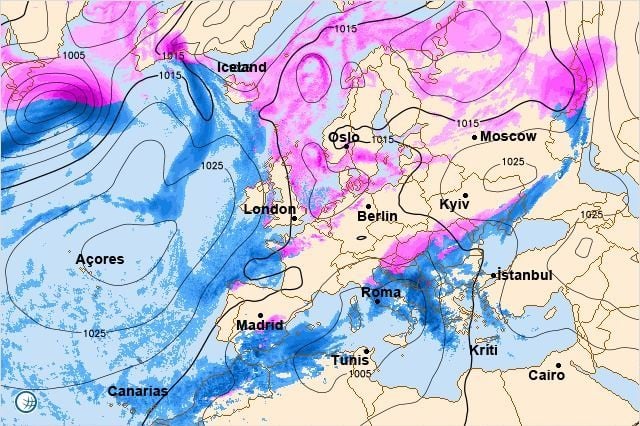 Над Европой складывается необычная синоптическая картина: полоса повышенного давления тянется от Португалии и Испании через Германию и Польшу до Украины. Это серьезно повлияет на погоду в нашей стране в понедельник, 5 января.