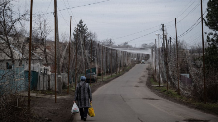 Жінка йде вздовж дороги під антидроновими сітками, Донеччина, 20 березня 2026 року. Getty Images/Anadolu/Maciek Musialek