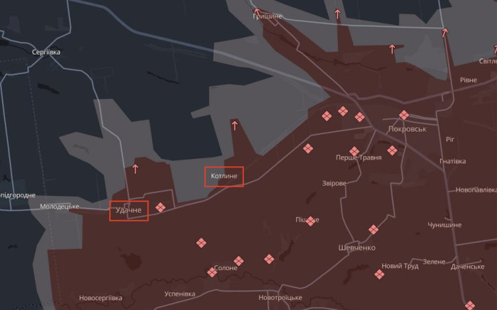Удачне та Котлине на Покровському напрямку. DeepStateMap"Припускаємо, що це повʼязано із поліпшенням погодніх умов, саме по тому, що почало більше підсихати. Зʼявилися умови для зчеплення техніки із землею, "зійшла" вода", — пояснила Катерина Мирончук.