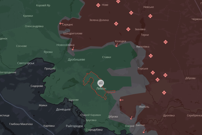 Орієнтовна лінія зіткнення біля Лимана. DeepStateMap"Натомість ми активно відпрацьовуємо по цих самих вогневих засобах противника, активно працюємо по ворожій піхоті — не дозволяємо їм наближатися до переднього краю, щоб в жодному разі вони не могли накопичуватися там", — розповів Василь Денисюк.