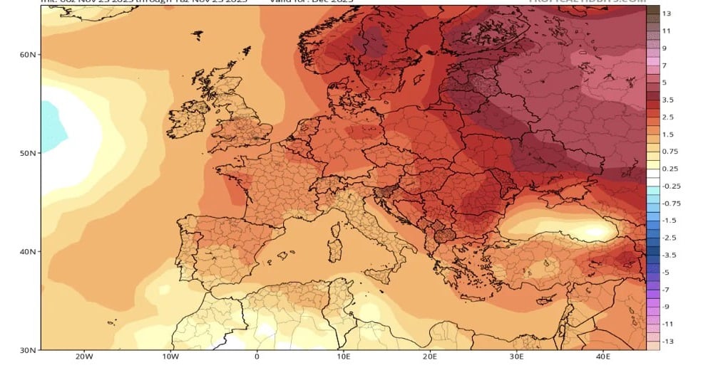 На карте видно, что почти вся территория Украины прогнозируется существенно теплее климатической нормы: в центральных и южных областях аномалия в основном составляет около +2…3 °C, а на севере и востоке местами до +4…5 °C, то есть декабрь ожидается заметно теплее обычного по всей стране: