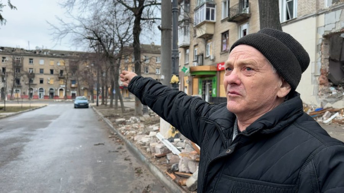 Олександр показує на свій зруйнований будинок. Суспільне Донбас