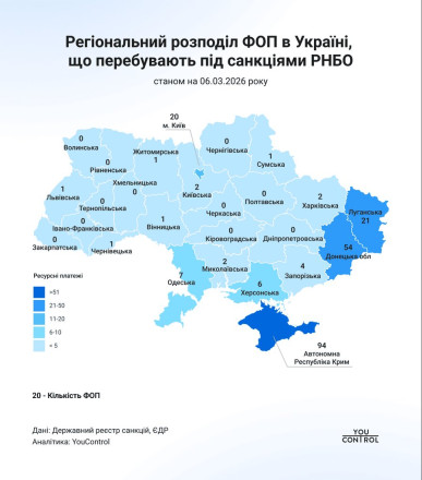 Більшість підсанкційних ФОП зареєстровані в Криму та на сході України. YouControl
