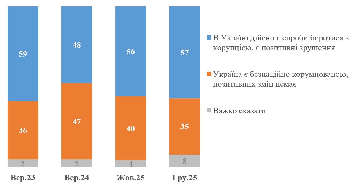 Несмотря на скандалы в энергетическом секторе, восприятие борьбы с коррупцией существенно не изменилось, 57% респондентов считают, что в стране предпринимаются реальные шаги и есть позитивные сдвиги. 35% убеждены, что Украина остается «безнадёжно коррумпированной».
