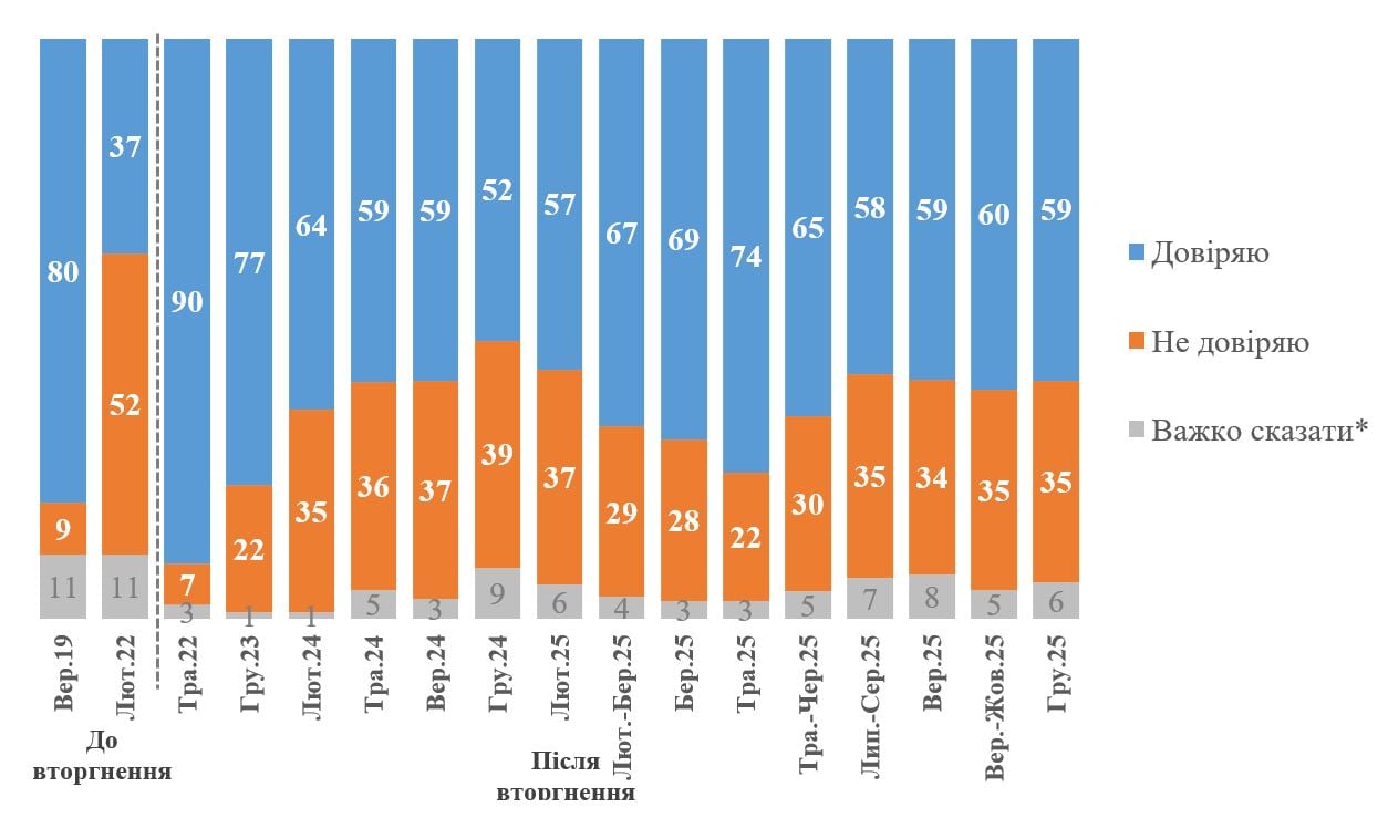 Таким образом, после публикации информации о коррупции в энергетическом секторе доверие снизилось примерно на 10 процентных пунктов, но затем вновь выросло на фоне международных переговоров о мире. К концу года наблюдалась тенденция к небольшому снижению доверия, однако уровень остался выше, чем в конце 2024 года.