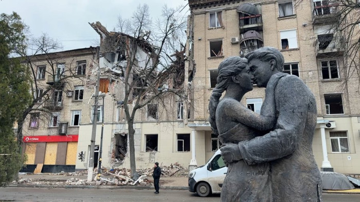 Пам’ятник закоханим та розбитий ударом 2 березня будинок в центрі міста Дружківка, Донеччина, 18 березня 2026 рік . Суспільне Донбас/Кадр з відео