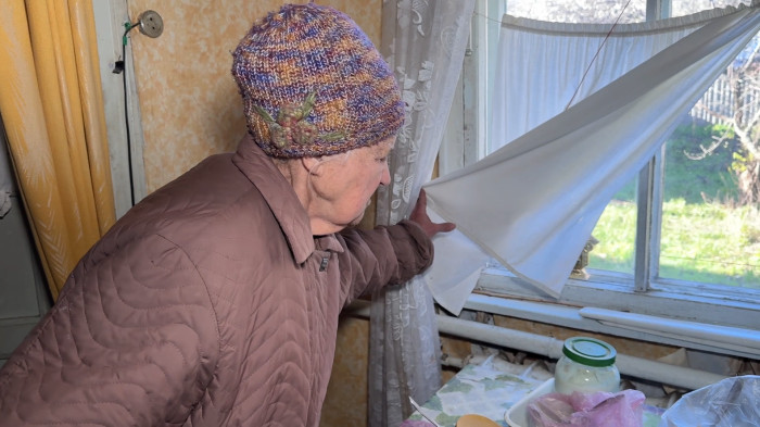 Лідія показує пошкодження після атаки ввечері 6 квітня. Суспільне Донбас/Кадр з відео