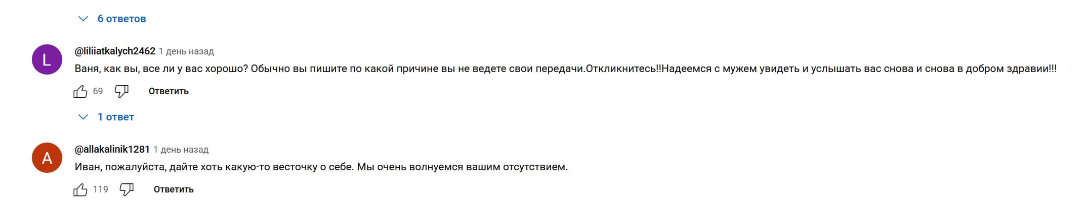 Иван, здравствуйте. Надеюсь, что у Вас все хорошо. После обстрела Львова Вы не транслируете новые видео. Скажите, пожалуйста, что с Вами все в порядке. Волнуюсь. Ваня, как Вы, все ли у вас хорошо? Обычно Вы пишите, по какой причине Вы не ведете свои передачи. Откликнитесь! Надеемся с мужем увидеть и услышать Вас снова и снова в добром здравии!