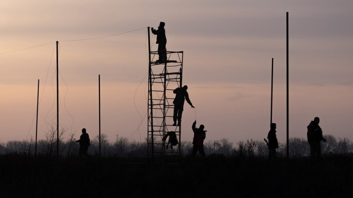 Військові інженерного підрозділу натягують сітки над однією з доріг Донеччини. Через велику кількість дронів і роботизованих систем на фронті небезпечна для перебування людини зона значно розширилась. Суспільне Новини/Олександр Магула