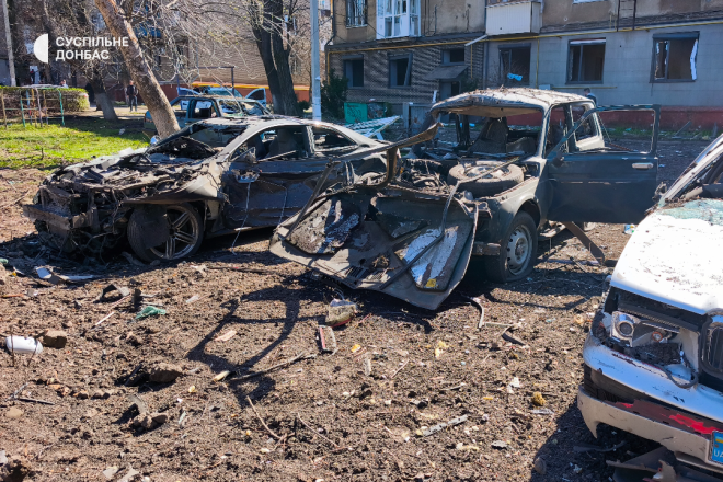 Пошкоджені авто біля багатоквартирного будинку у Краматорську. Армія Росії вдарила по місту Донеччини вдень 6 квітня 2026 року з РСЗВ «Смерч». Суспільне Донбас/Олена Зайцева