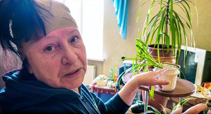 Жителька Краматорська Антоніна. Суспільне Донбас/Кадр з відео"Хлорофітум, ось, поламався, але він мене спас. Горщик впав мені на голову. А потім вже на землю і на квітку попадало скло. Першою мене вдарила по голові квітка. Ось такими гострими кінцями просто на ліжко летіло все".