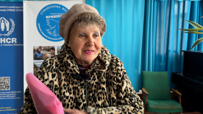 Зоя в евакуаційному пункті після того, як їх із чоловіком вивезли з Добропілля. Суспільне Донбас/Кадр з відео