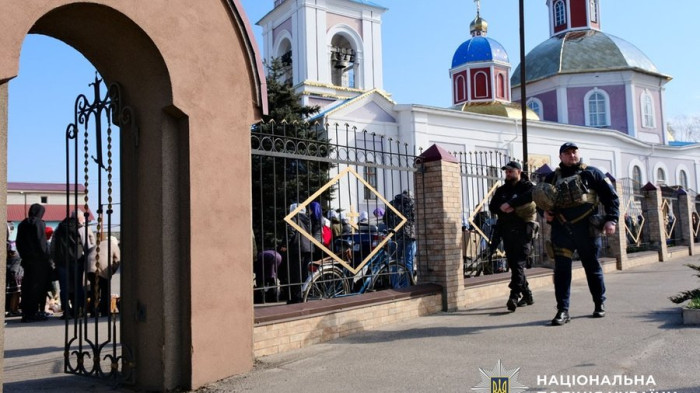 Правоохоронці на Великдень на Донеччині патруллють біля храму. Національна поліція Донеччини