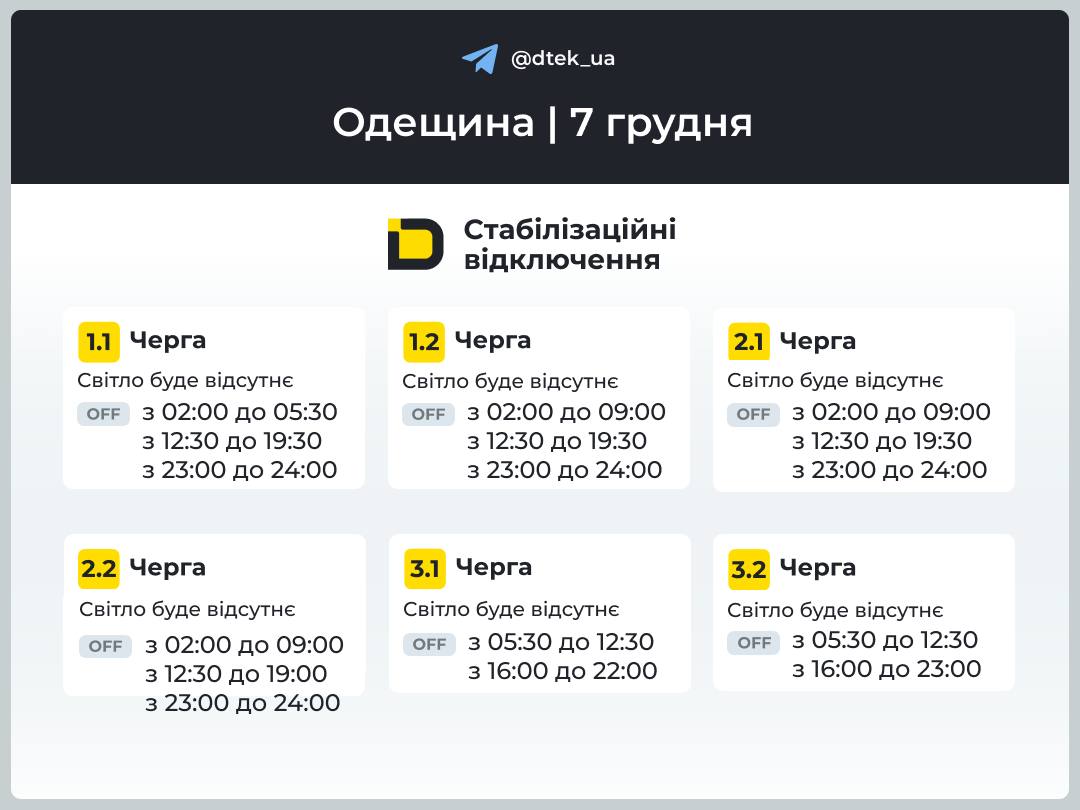 В свою очередь, компании «ДТЭК» опубликовали графики отключения электричества на 7 декабря для Киева и Киевской области, Днепропетровщины и Одесчины.