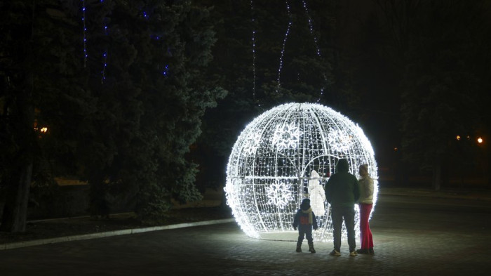 Люди йдуть площею, прикрашеною до різдвяних та новорічних свят у тимчасово окупованому Донецьку 31 грудня 2024 року. AP/Alexei Alexandrov