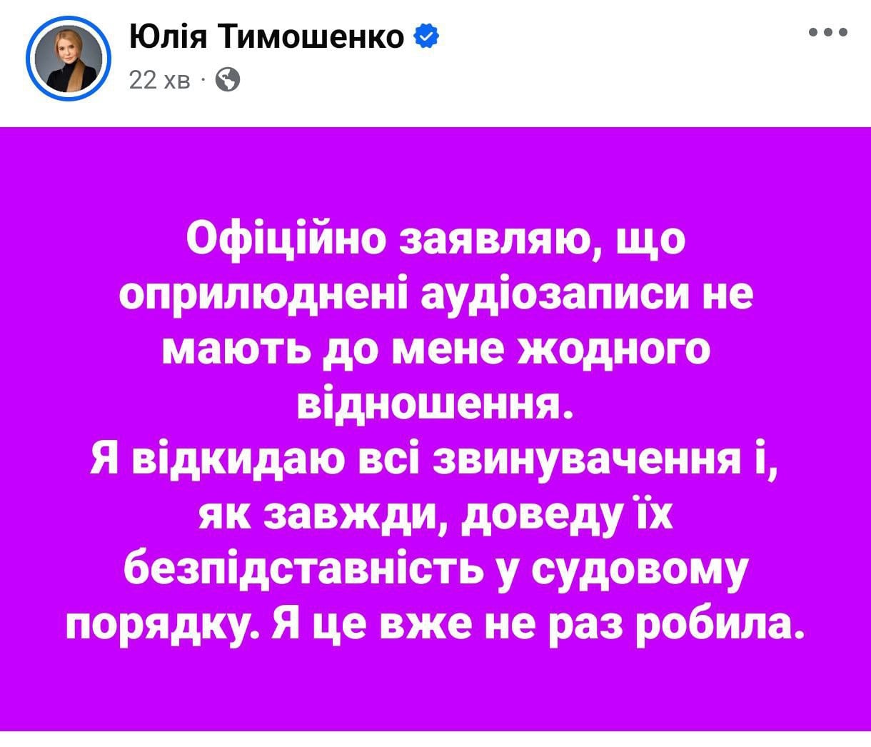 Тимошенко заявила, что обнародованные аудиозаписи «не имеют к ней никакого отношения». Она написала, что «отвергает все обвинения» и обещает «доказать их безосновательность в судебном порядке», подчеркнув, что «уже не раз» делала это раньше.