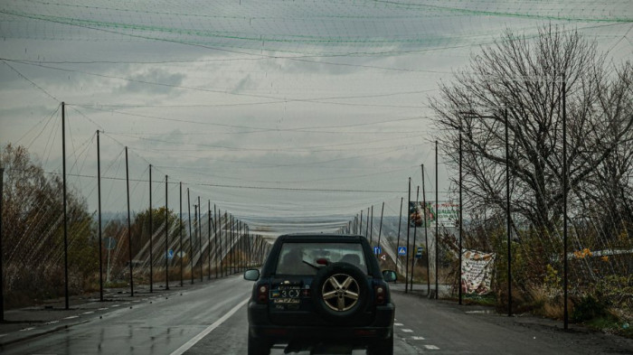 Автівка їде по дорозі, яка накрита антидроновою сіткою. 115 ОМБр