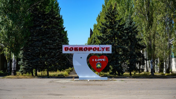Сліди від танків на дорозі перед знаком у центрі міста з написом «Я люблю Добропілля», 23 вересня 2025 року. Getty Images/Scott Peterson