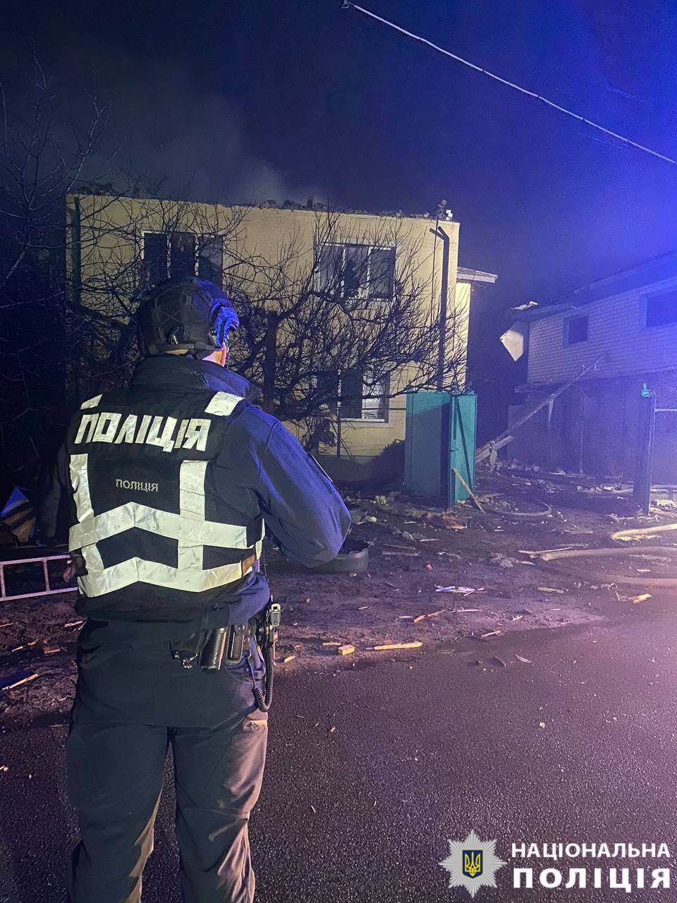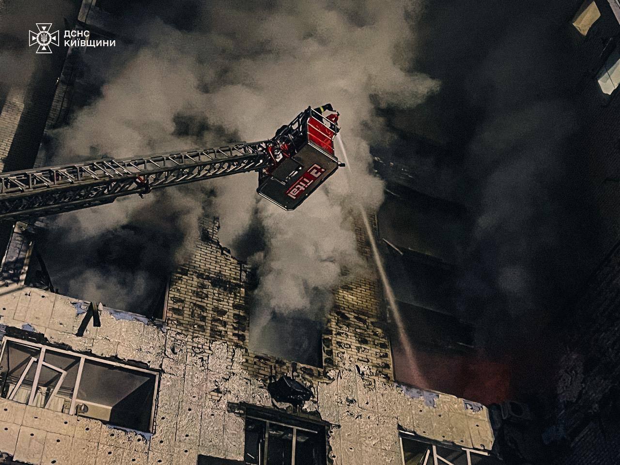 На Фастовщине обломки беспилотника попали в 10-этажный жилой дом, вызвав пожар и обрушение на 6-7-м этажах. Спасатели эвакуировали 150 человек. Среди пострадавших мужчина с шестого этажа и женщина с девятого, которых деблокировали спасатели. 26-летний мужчина получил ожоги и был госпитализирован. К сожалению, было обнаружено и тело погибшего мужчины 1988 года рождения.
