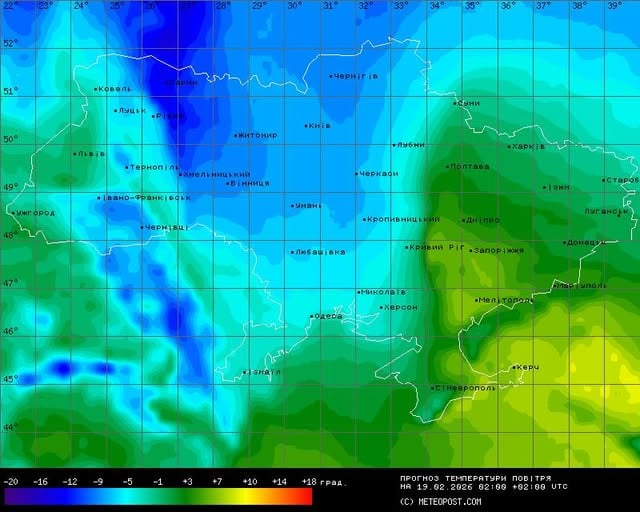 По прогнозу синоптика Натальи Диденко, в ночь на 19 февраля температура воздуха на севере, местами в центре и на Одесчине опустится до −12…−9 °C. На остальной территории ожидается −9…−4 °C, а на юге и в Закарпатье будет около 0 °C.