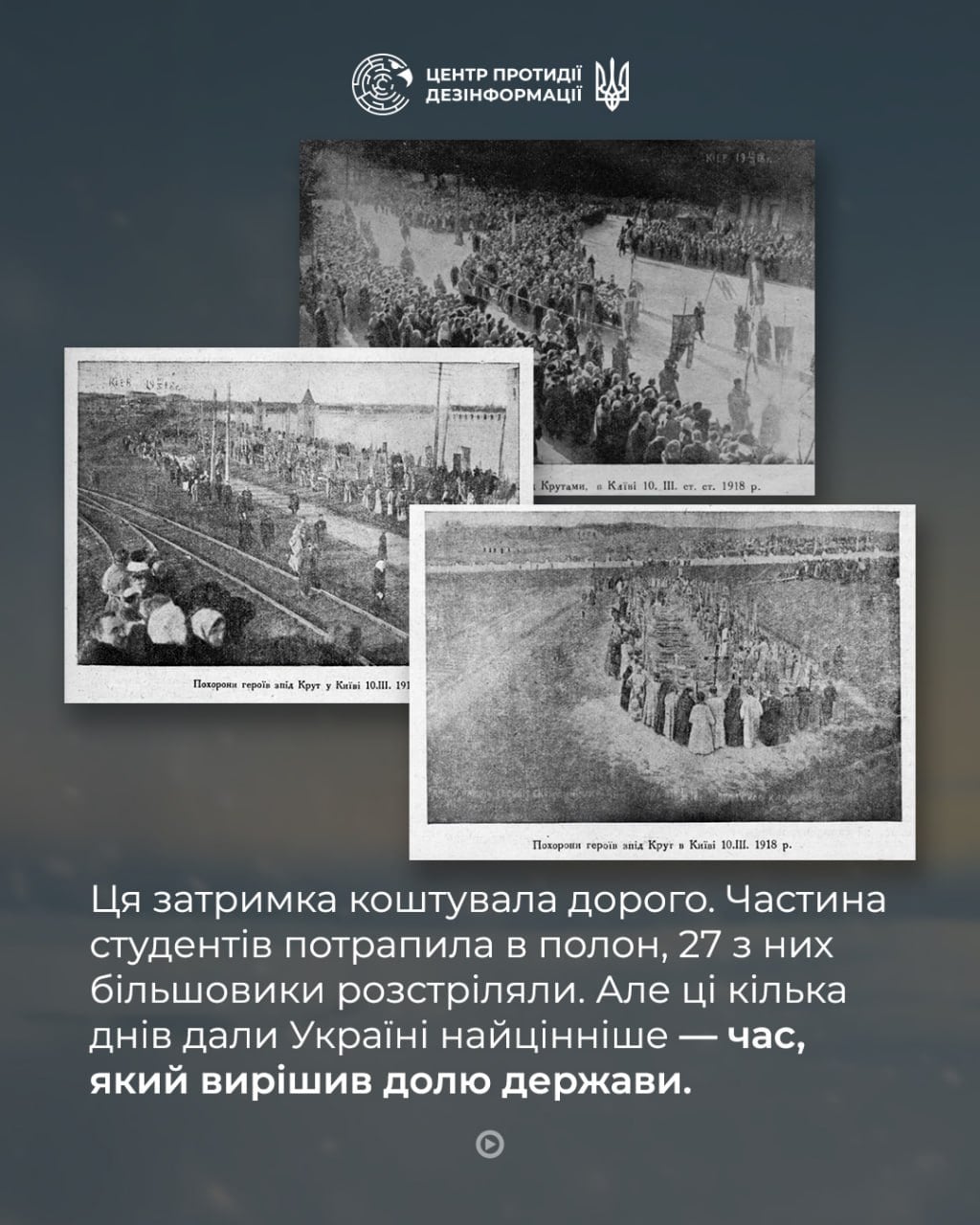 Станция Круты стала местом памяти и трагедии, где были расстреляны студенты, а сегодня — символом непрерывной борьбы за свободу Украины от оккупантов. Россия за сто лет не изменила методов войны: оккупация сопровождается убийствами, пытками, мародерством и геноцидом.
