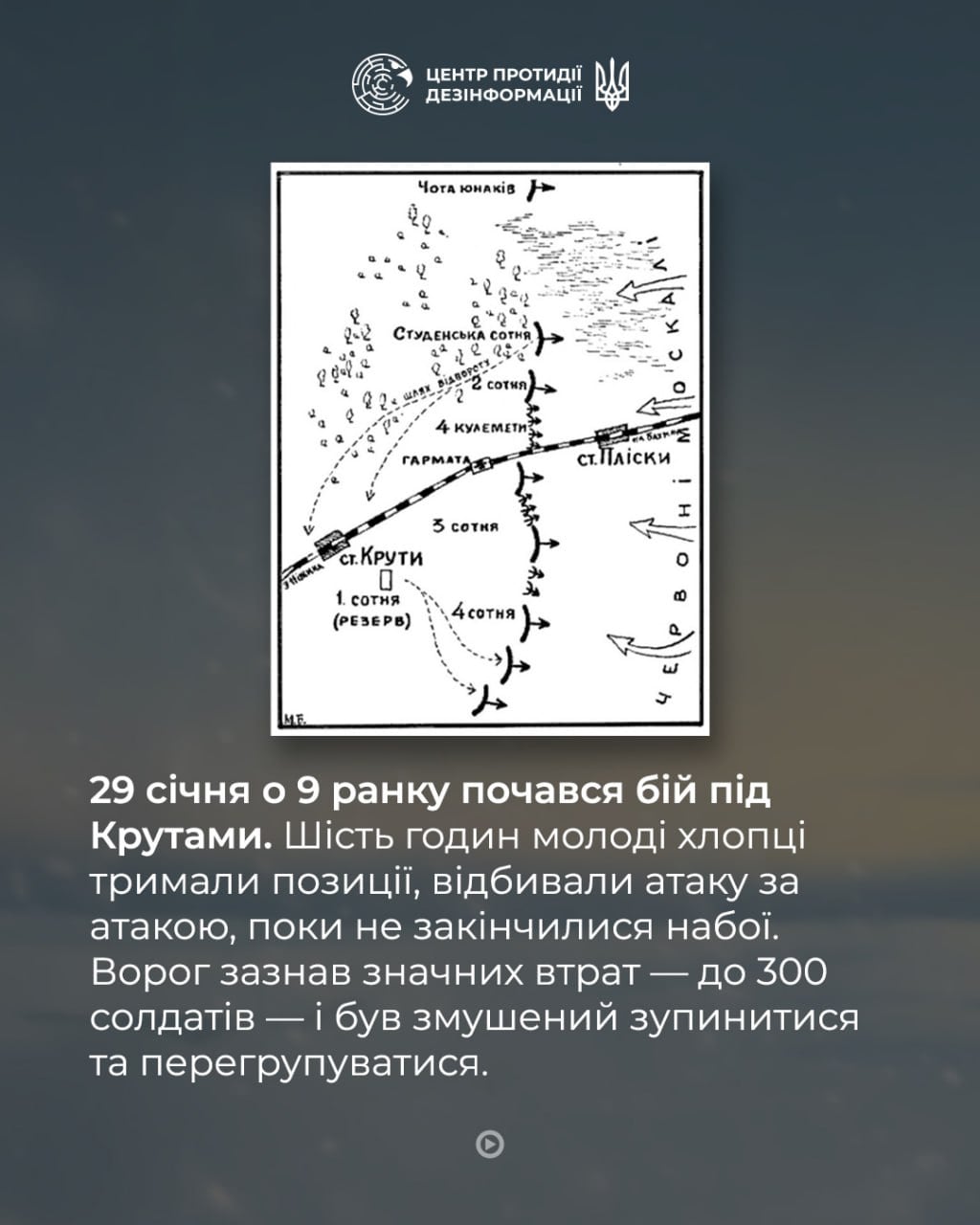 В Украине исторический бой под Крутами стал символом патриотизма и самопожертвования украинской молодежи. Их подвиг задержал наступление врага и дал шанс молодой государственности закрепиться на международной арене, передает Генштаб ВСУ.