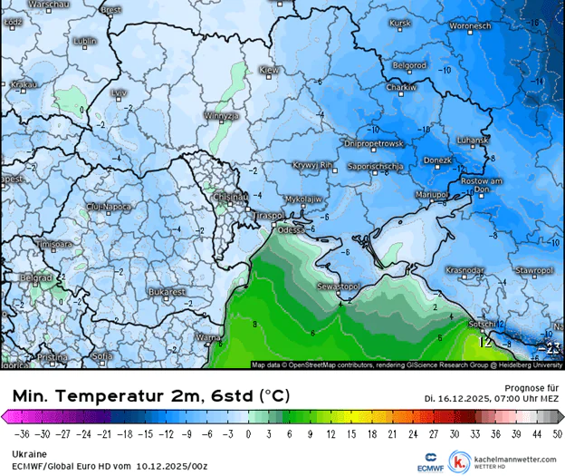 По расчётам моделей, пик холода придётся на ночь с 15 на 16 декабря. Самые низкие температуры: восточные области –12…–9, Днепропетровщина до –12, северо-восток до –10. На западе и юге в этот же период днём останется выше нуля, ночами небольшие минусы.
