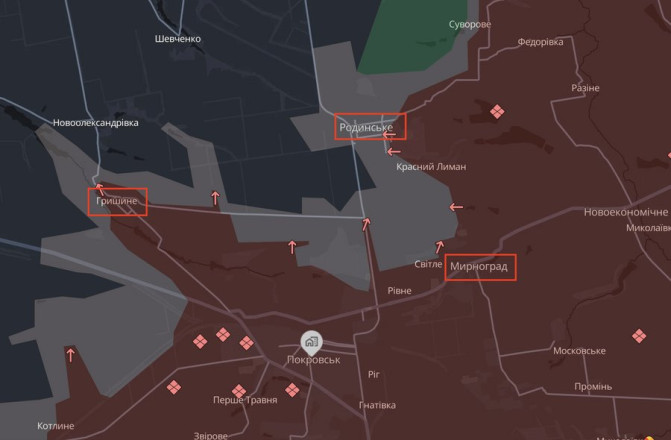 Основні вектори атак військ РФ — район Гришиного та напрямок Родинського. За даними Сил оборони, окупанти намагаються просуватися флангами та діяти тактикою "малих клешень". Зокрема, в центрі Гришиного тривають стрілецькі бої.