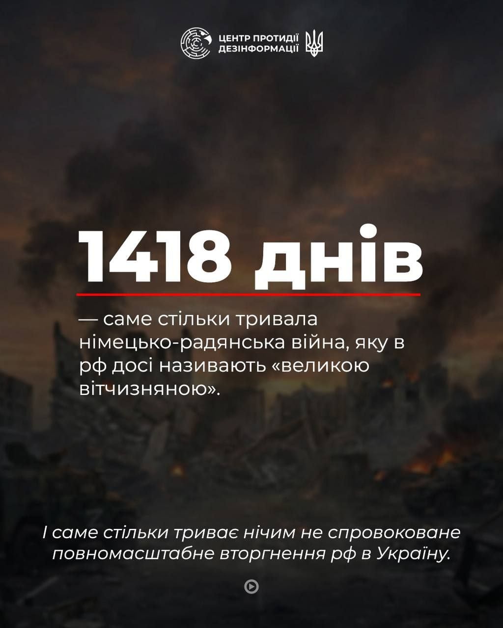 Полномасштабная агрессия РФ против Украины продолжается уже почти четыре года и превысила по длительности советско-немецкую войну 1941–1945 годов. В самой России государственным медиа запрещено проводить такие сравнения, сообщает Центр противодействия дезинформации.