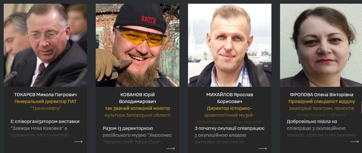 ГУР также опубликовал сведения о лицах, причастных к захвату Национального историко‐археологического заповедника Каменная Могила и его незаконному включению в состав так называемого музея‐заповедника Херсонес Таврический в оккупированном Крыму. Под прикрытием «временных экспозиций» они вывозили украинские музейные экспонаты.