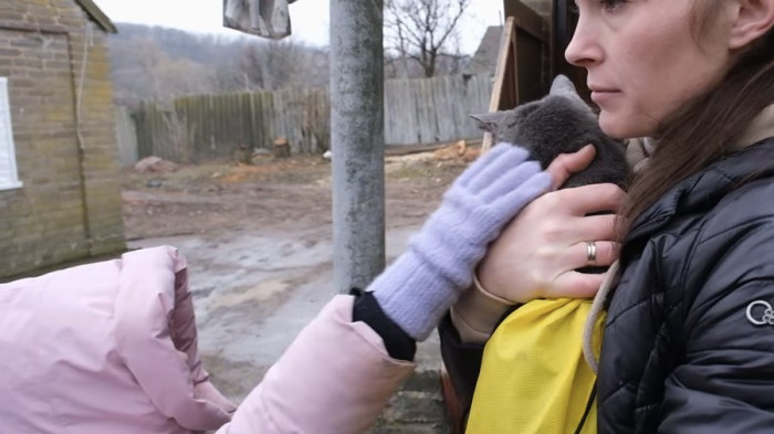 Евакуювана родина з їх котом. Кадр з відео ГУ Нацполіції у Донецькій області