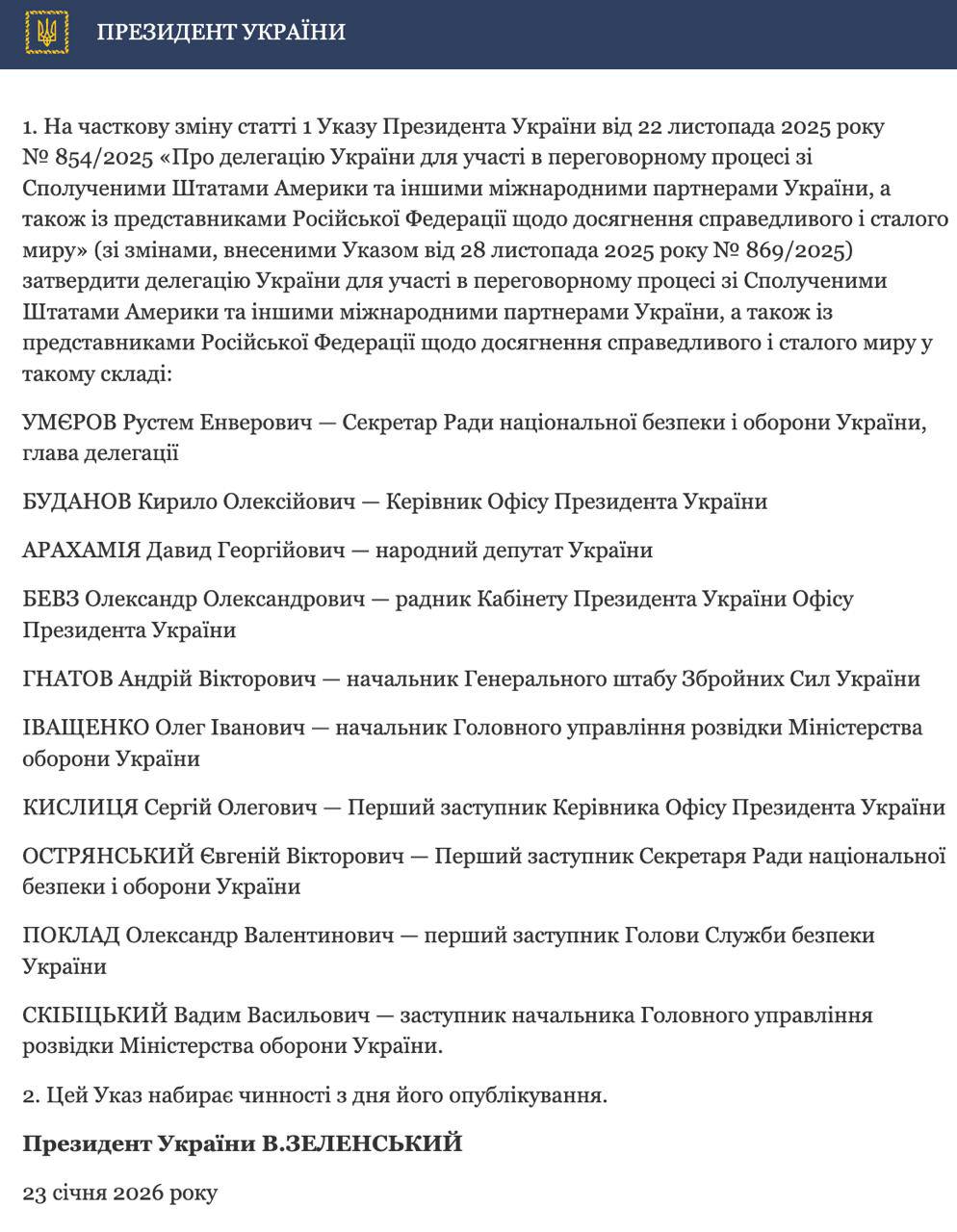 Состав украинской делегации для переговоров с США и РФ в столице Объединенных Арабских Эмиратов стал известен вчера, 22 января. Ее возглавляет секретарь СНБО Рустем Умеров. Также Киев направил в Абу-Даби главу Офиса президента Кирилла Буданова, первого заместителя руководителя ОП Сергея Кислицу, главу парламентской фракции «Слуга народа» Давида Арахамию и начальника Генштаба ВСУ Андрея Гнатова.