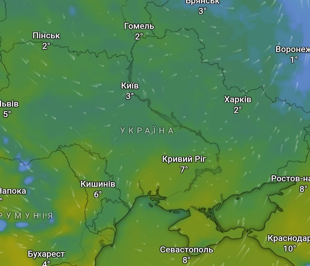 Температура ночью −3…+3 °C, днем +1…6 °C, а на крайнем западе и в Одесской области воздух может прогреться до +7…12 °C.